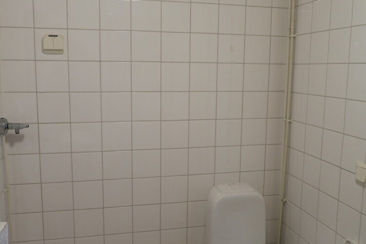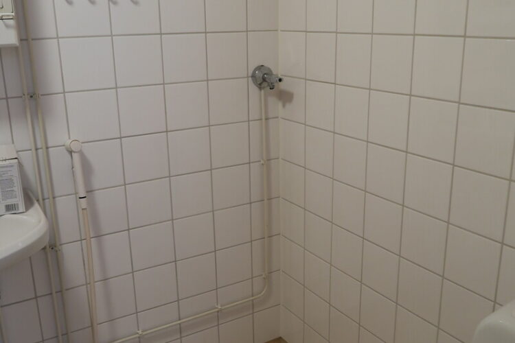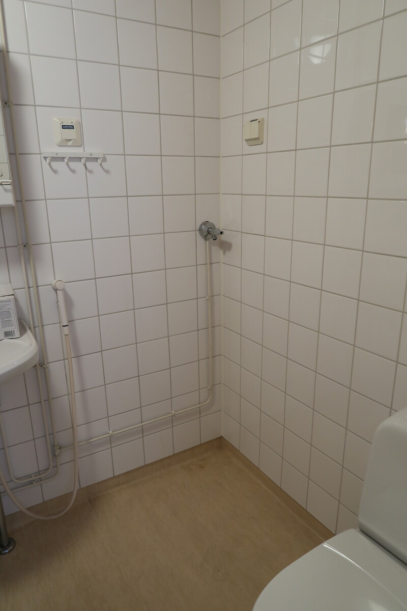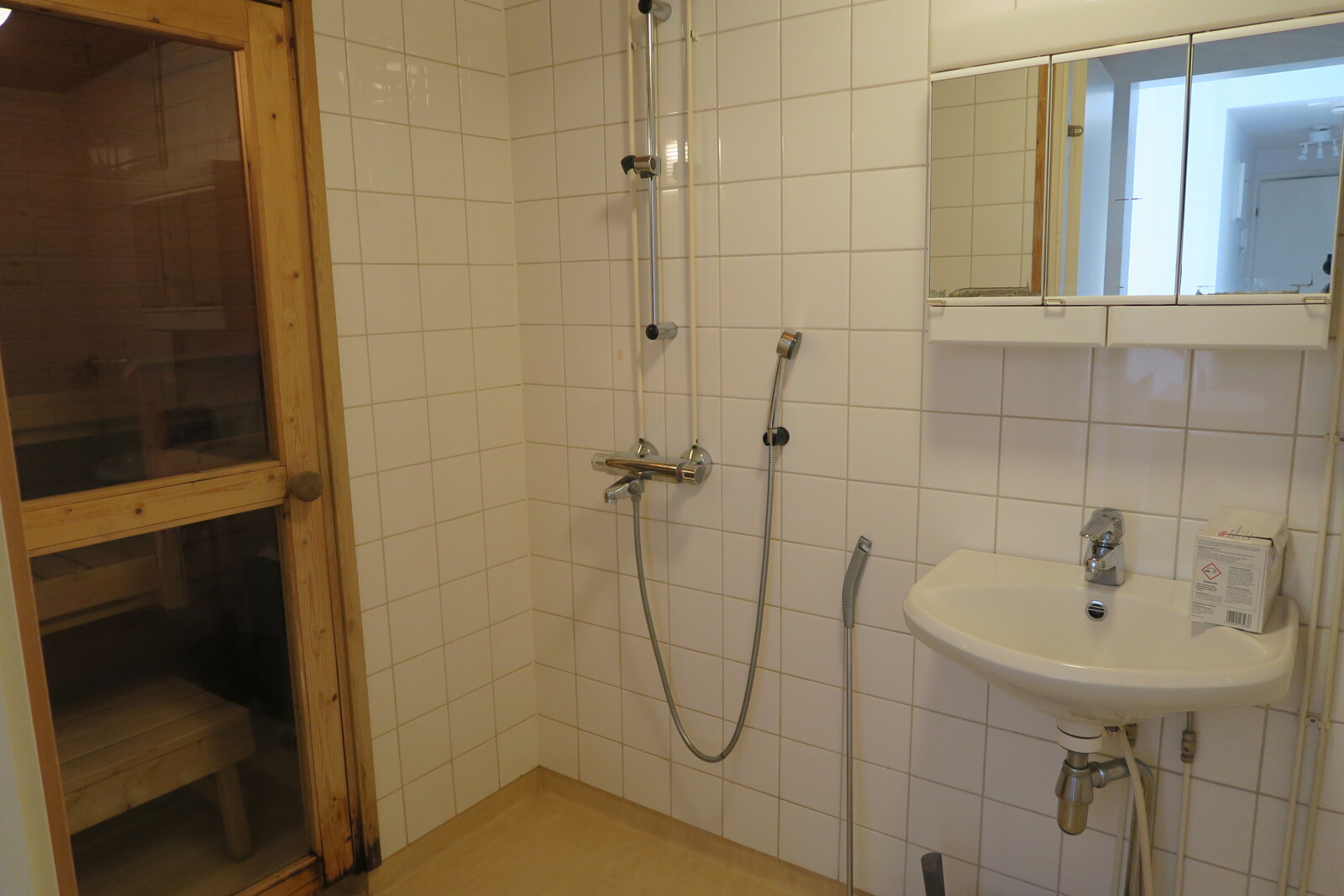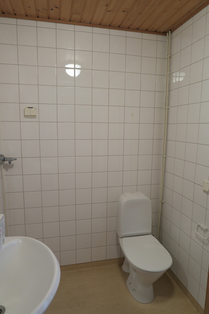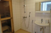 Kylpyhuone suihkuseinä, pesukoneliitäntä, wc-istuin, suihku, peilikaappi