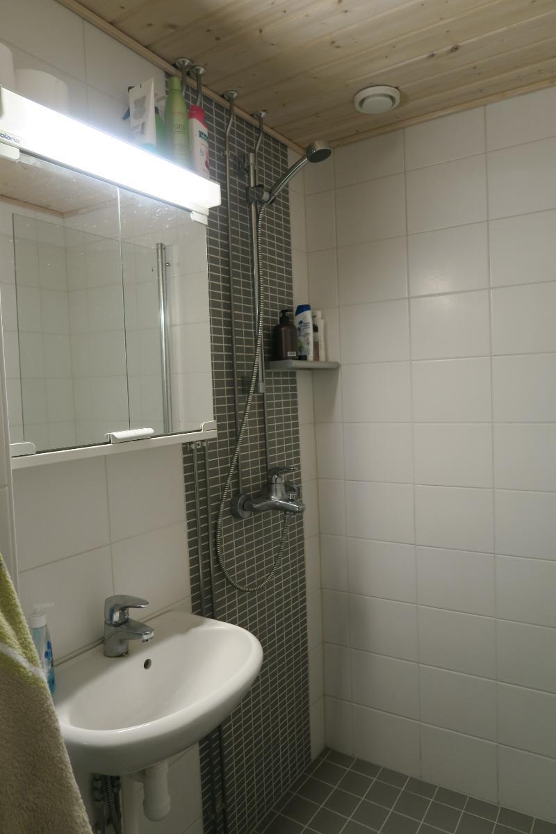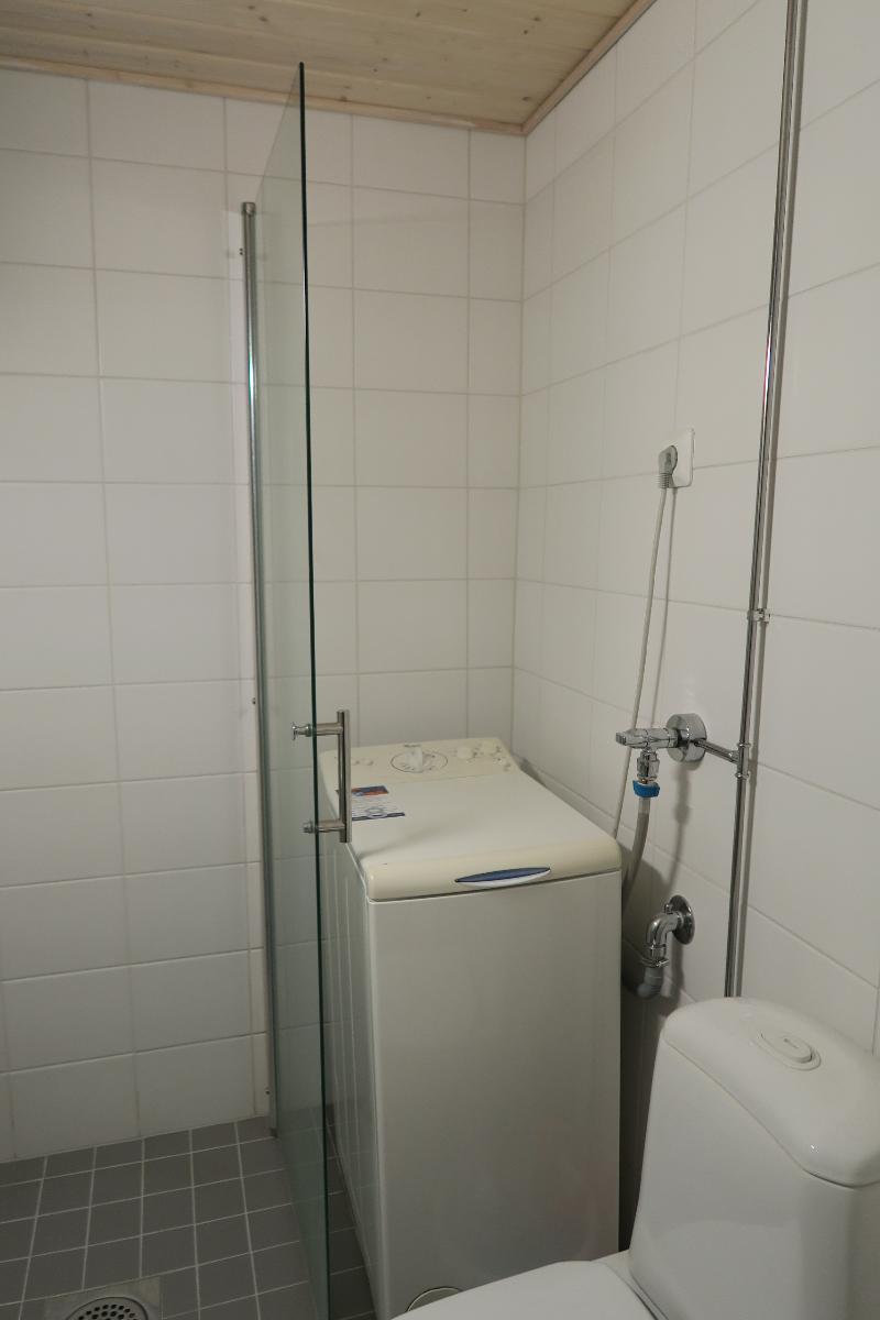 Kylpyhuone suihkuseinä, pesukoneliitäntä, lattialämmitys, wc-istuin, suihku
