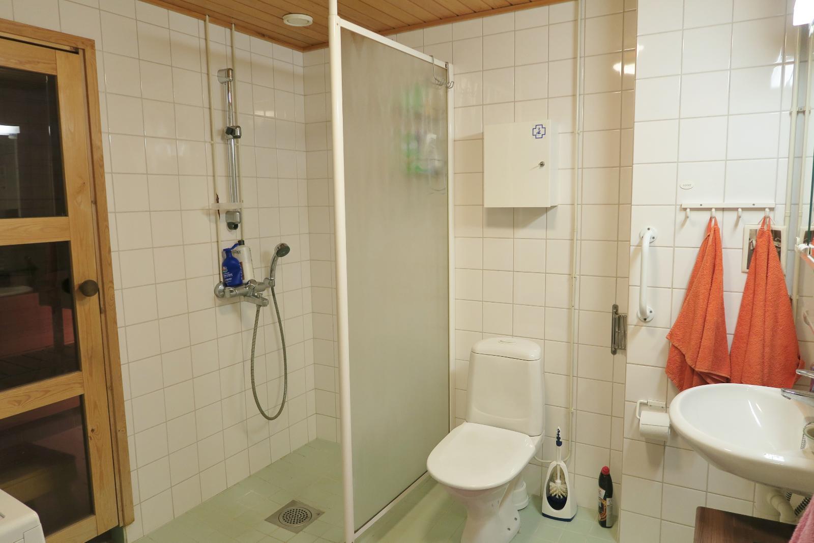 Kylpyhuone pesukoneliitäntä, wc-istuin, suihku, peilikaappi